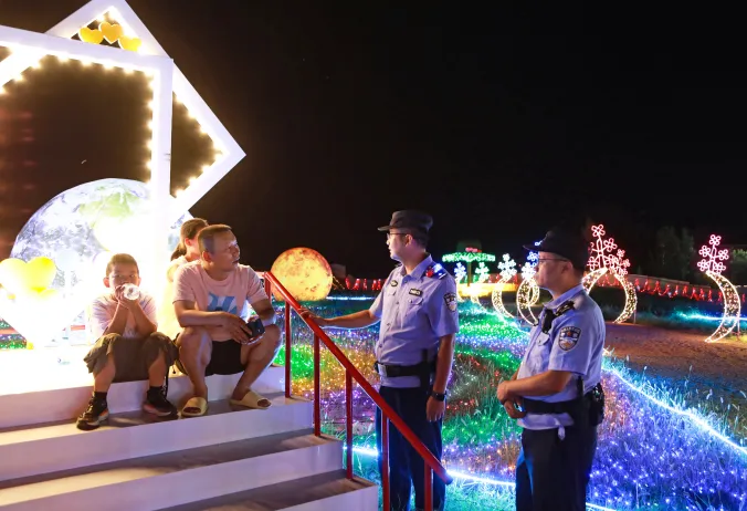 “大家看管好个人财物”“各位家长请看好孩子”“注意不要酒后驾车”……7月17日晚,警徽下红蓝肩灯闪烁,着装整齐的民辅警在“千年府州·边塞将城”旅游文化推介活动现场开展巡逻,提醒游客做好安全防范,与会场设施负责人、美食摊位摊主、娱乐场负责人面对面交流,登记相关信息,开展业务咨询,普及消防安全、禁毒禁赌、反诈骗等知识,强化安全隐患排查和治安管控,全力保障活动安全顺利进行。
