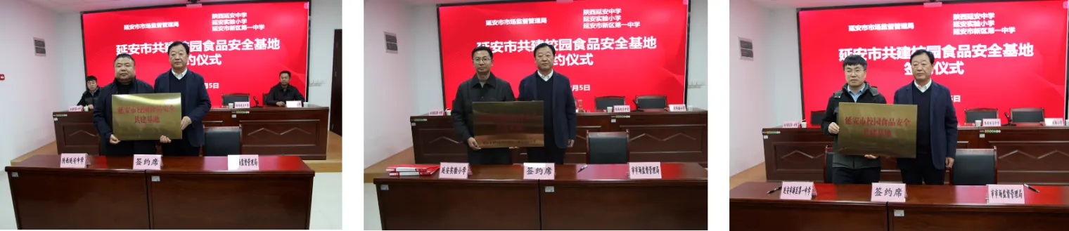 会上,陈彦介绍了共建基地的工作要求。共建学校代表、延安中学校长郭博作表态发言。刘新光分别与延安中学、延安市新区第一中学、延安市实验小学签订了“校园食品安全共建基地”框架协议,标志着共建基地建设正式启动,该基地将为打造经得起检验的“放心工程”“样板工程”、带动全市校园食品安全水平整体提升搭建坚实平台。