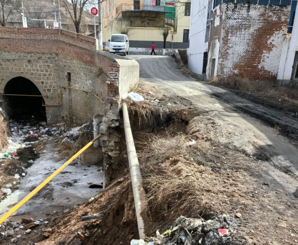 群众身边无小事。宝塔区人民检察院在履行公益诉讼检察职能中发现,在宝塔区青化砭镇农贸市场居民区有50余米长的沿河道路,于2023年下雨冲毁坍塌,坍塌物堆积左侧河道,严重影响河道的行洪安全,坍塌致使河道边上的天然气和饮用水管道裸露在外,存有断裂泄露的安全隐患。