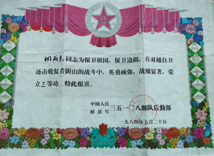 在者阴山前线,猛烈的炮火、复杂的地形、多变的热带气候给参战士兵带来了巨大挑战。他们不仅要克服水土不服带来的困扰,还要面对狡猾的敌人和蚂蟥、毒蛇等害虫的威胁。作为军区的后勤保障,31师汽车连担负着为前线阵地运输武器弹药、军需物质的任务,运输任务听起来好似没有在正面战场上那么凶险,但在敌人炮火封锁区,运输部队确是敌军重点攻击的对象。为躲避越军的飞机轰炸,运输部队常常只能在夜间闭灯行驶,运输途中有敌军潜伏,车下是泥泞道路,路上甚至还有敌军埋下的地雷,就是这样的环境,汽车连仍无数次地穿梭于枪林弹雨间,历经生死,为前线源源不断的送去了军需物资。在一次拔点作战任务中,大部队亟需提前到达指定的合围地点,前线紧缺架桥物资,严重阻碍了行军速度,田雨来得知后主动报名参加此次紧急战备物资运输任务,在战火硝烟中一刻不歇地将所需物资送往前线,为战斗的顺利完成提供了物质保障。因对保卫边疆作出贡献,受到军区嘉奖一次,荣立个人三等功一次。