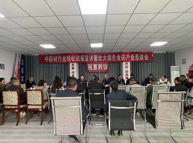 为助力县域中药材产业蓬勃发展,4月3日,国家税务总局城固县税务局以第33个全国税收宣传月为契机,积极发挥绿色食药产业“税务管家”团队作用,组织召开了“税惠到坊——中药材行业税收政策宣讲暨壮大绿色食药产业恳谈会”,与20户大型元胡种植合作社代表们齐聚一堂,面对面共话税收,共谋发展。
