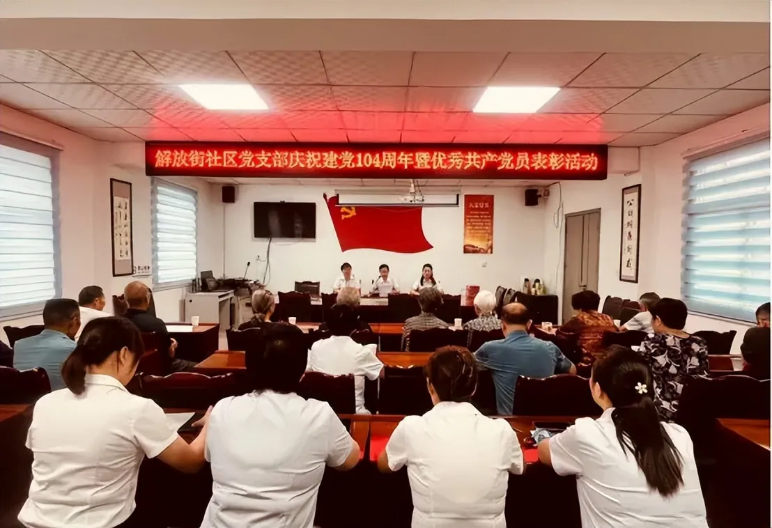 6月24日,组织社区党员召开了纪念建党104周年暨优秀共产党员表彰大会。活动中奏唱《中华人民共和国国歌》,重温入党誓词,为16名光荣在党50年的老党员颁发佩戴纪念章。