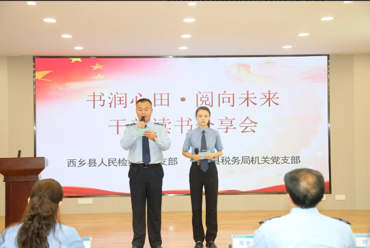 4月28日下午,西乡县税务局机关党支部联合西乡县人民检察院党支部开展“书润心田.阅向未来”干部读书分享会。西乡县人民检察院党组书记、检察长张艳,党组成员、支部书记魏娜,党组成员、政治部主任方世华及西乡县人民检察院干警代表,西乡县税务局党委书记、局长周俊安,党委委员、副局长符健,党委委员、副局长姚兴国,机关党支部全体党员及青年干部代表参加。