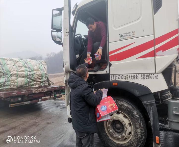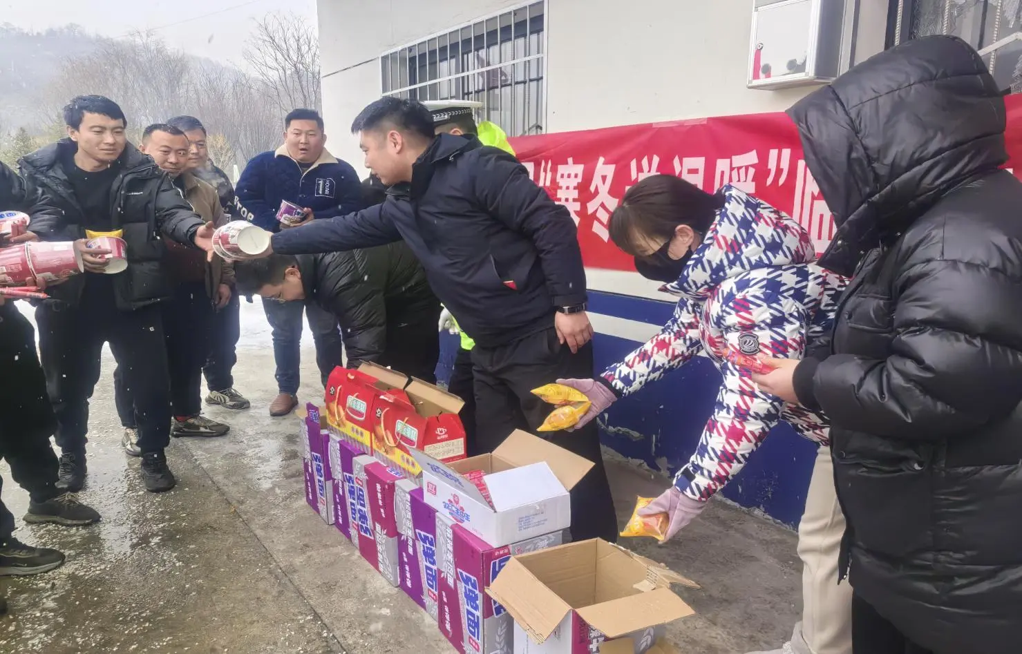 富县民政局第一时间组建党员先锋队,携带方便面、面包、火腿肠、饮用水等应急物资,顶着风雪奔赴县域内各高速路口,搭建起临时救助点,热心为每一位受困群众发放物资,并向他们宣传雨雪天气安全防范知识,提醒他们注意保暖和出行安全。