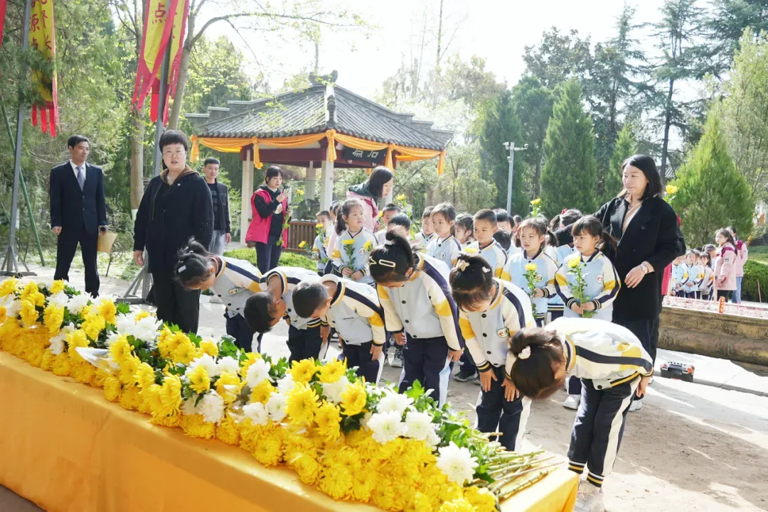 孩子们收敛了往日嬉闹的天性,在教师的引导下三鞠躬表示敬意,献菊花表达缅怀,绕墓一周表示传承,他们慎重、自信、坚定。