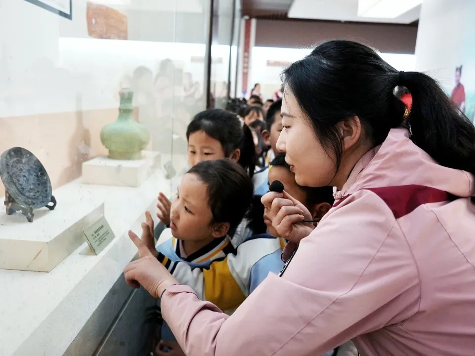 展馆内,陈列着来自千年前的文物,古币、青铜器、陶器、石刻拓印等散发着浓郁的历史气息。孩子们看着丝绸之路的地图惊叹于张骞的坚韧不拔,聆听着张骞的历史故事陶醉于张骞的忠心报国,看着胡萝卜、核桃等物品感念着张骞的卓越伟大。