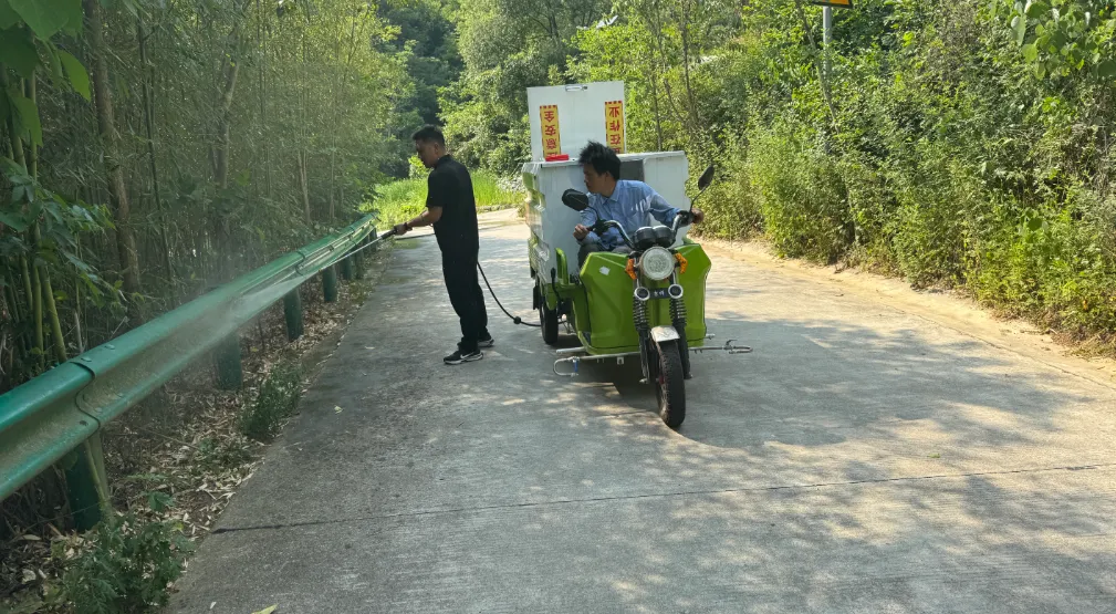 随着高压冲洗车的轰鸣声响起,整治行动正式拉开帷幕。高压冲洗车充分发挥其高效清洁优势,强劲的水流如利剑般冲刷着路面上的泥土、油污和顽固污渍,原本沾满污垢的路面在水流的冲击下渐渐露出干净整洁的面貌。道路管护员们则驾驶着三轮车,跟随在冲洗车后,及时清理冲洗下来的垃圾,确保路面不产生积水和淤泥堆积。