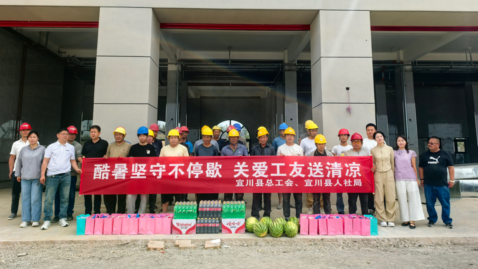 6月23日,宜川县人社局联合宜川县总工会,深入辖区三个在建项目工地,开展2025年“关爱职工•夏送清凉”慰问活动,为奋战在施工一线的90余名农民工送去了雨伞、白糖、水杯、洗衣粉、西瓜、饮料等防暑降温物资,将党和政府的关怀、工会“娘家人”的温暖送到劳动者的心坎上。
