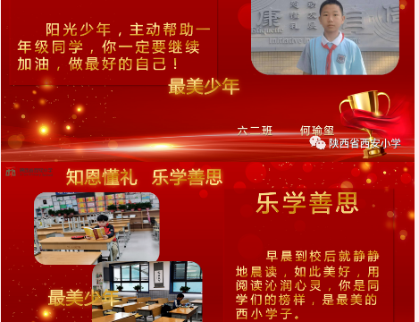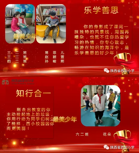 陕西省西安小学第三课堂,评价牵引——行走中的德育课堂 德育无形,润心有声,通过激励评价行为语录,塑造西小学子积极向上精神风貌,提升学生品格修养,塑造“知恩懂礼、乐学善思、知行合一”西小少年。以美养德,以德育人,德美共生,落实立德树人,坚持五育并举,达到学思知行的融合统一,为学生终身成长奠基。(温娜)