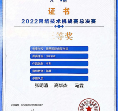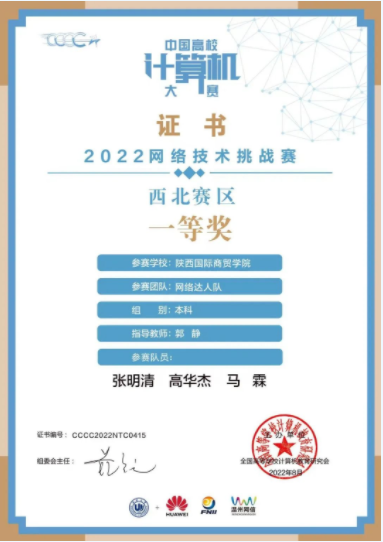 近日,2022年中国高校计算机大赛——网络技术挑战赛圆满落幕。陕西国际商贸学院荣获全国三等奖1项,西北赛区一等奖1项、西北赛区三等奖4项。陕西国际商贸学院信息工程学院郭静老师指导的参赛队伍(张明清、高华杰、马霖)在总决赛中获得本科组全国三等奖的历史最好成绩。