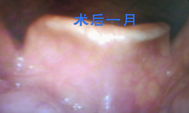术后1小时即可进半流食,无迟发性出血、无呼吸困难;术后第一天复查电子喉镜见术区创面白膜形成,会厌无水肿;术后第二天出院;术后12天白膜完全脱落,病变彻底切除。