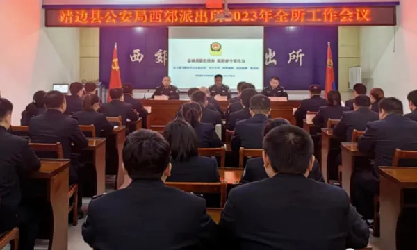 2月17日上午,靖边县公安局西郊派出所组织召开2023年全所工作会议。学习贯彻落实中省市各级政法、公安工作会议精神,重点传达学习全县公安工作暨党风廉政建设会议精神,表彰奖励先进个人,回顾总结去年工作,分析当前面临的严峻形势和存在的主要问题,全面安排部署2023年全所工作。会议由教导员杨喜宏主持,全体民辅警参加了会议。