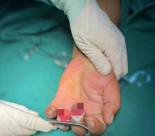 考虑到实用性及日后生活的美观,王辉王主任专门为患者定制给手指“搬家”。就是将双足踇甲瓣游离切取,踇甲瓣移植再造手指远节指体。经过近8小时的手术后,再造指体成活。