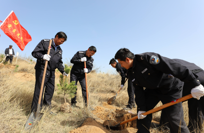 4月12日,府谷县公安局组织民辅警到大昌汗镇植树点开展义务植树活动。
