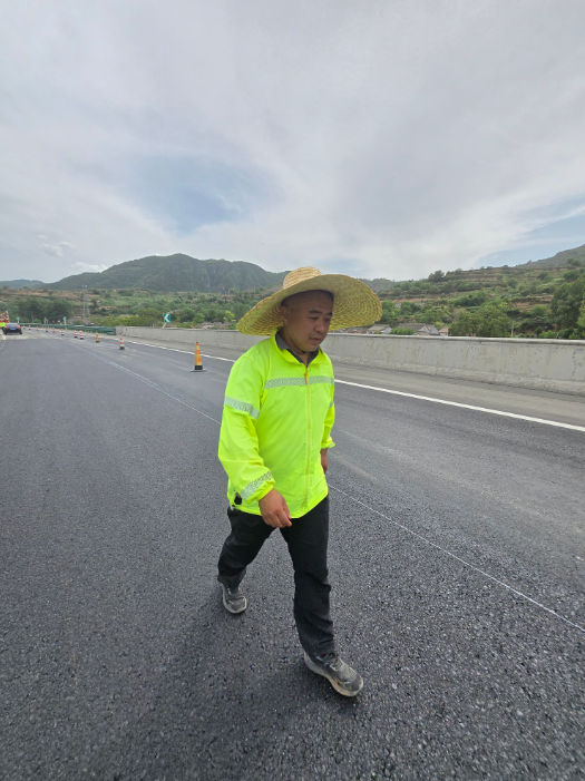 这两年的仲春到初夏,是“踏实哥”最“不踏实”的日子。分公司“春运结束进场施工、通行高峰期前完成涉路施工”的养护工程计划,成了邹怀立在心里的“军令状”。这段日子里,邹怀每天清晨5点上路,把施工点位、管控区域“盘”得明明白白。7点钟的机械轰鸣中,邹怀的“荧光绿”安全服穿梭在工地上,铣刨厚度够不够、油料温度高不高,必须由自己亲手测过才“算数”。每天晚上9点的复盘会,邹怀来不及脱下“荧光绿”,便拉着监理完善施工方案、调整进度计划、配置人员机械。记不清有多少大干的日子,邹怀穿着“荧光绿”和衣而眠,闷头一觉便奔赴工地,“荧光绿”再次闪耀在关山东阪的微凉晨风里。