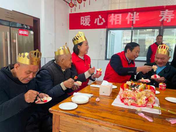 声,暖暖的阳光下,一群志愿者们和爷爷奶奶们围着大大的蛋糕唱起生日歌,为3月生日的老人们集体贺寿,并送上最真诚的祝福,老人们在众人的祝福下吃着生日蛋糕,脸上绽放着幸福的笑容。