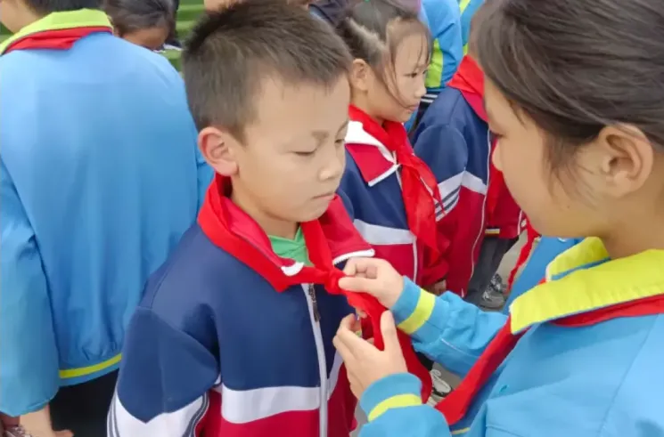 大队辅导员强彤老师宣读了新队员名单,16名学生光荣地加入了中国少年先锋队。在热烈的掌声中,六年级的老队员们走上前,为新队员佩戴上象征革命光荣传统的红领巾。那一抹鲜红在胸前飘扬,不仅是一份荣誉,更是一份责任的传承。新老队员互敬队礼,目光交汇间,是信念的交接,是精神的延续。