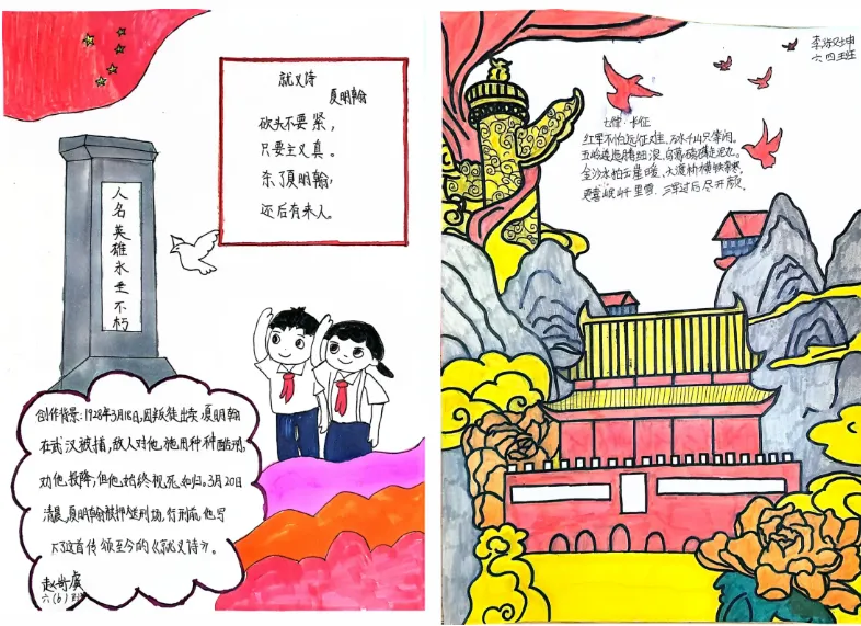 借助这一单元,同学们在阅读红色英雄人物读本以后,深有感触,积极参与到拓展型作业中来,以图文并茂的形式,搜集红色诗歌,一首首红色诗词,记录着党和人民坚韧不拔、不屈不挠的大无畏精神,呈现着中国共产党的光辉历史,以文字和色彩展示着对党的热爱、对革命先辈的崇高敬意。