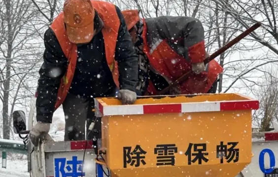 市公路局应急抢险支队队员吴江涛驾驶的除雪车打头阵,宽大的车铲刮过路面,积雪只留薄薄一层。紧接着,与除雪车保持100米车距的养护作业车开始抛撒融雪剂,李阳明驾驶着车辆缓慢行驶,工作人员张峰权、武会、吕西宁三人站立在车厢,一人查看融雪剂抛撒情况,其余两人配合开袋,一袋袋融雪剂流进后斗,随着螺旋叶片抛撒在路面上、钻进雪里,地面上消融出一个个小窟窿。