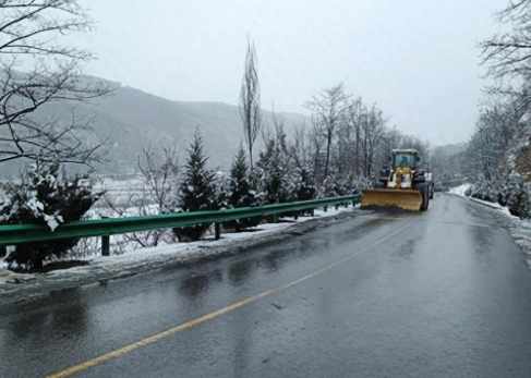 路政车鸣笛开道,装载机张开除雪铲,除雪机除雪滚快速转动,养护作业车喷洒环保型融雪剂。一轮作业下来,半幅柏油路露出灰白色的路面。