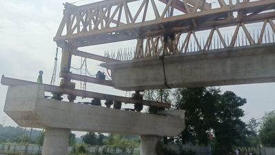该大桥全长336米,上部结构采用11*30M预应力砼先简支后连续小箱梁,需架设箱梁88片。为确保首片箱梁精准架设,武功县交通运输局多次组织监理、施工单位召开箱梁安装架设专项施工方案会、箱梁架设首件交底会,全面梳理施工要点,从设备的运输、组装、试运行等方面精准把控施工细节,为首架的顺利进行奠定了坚实基础。架设准备期间,对桥梁箱梁架设安全、质量提出了相关要求,确保如期完成架梁任务。