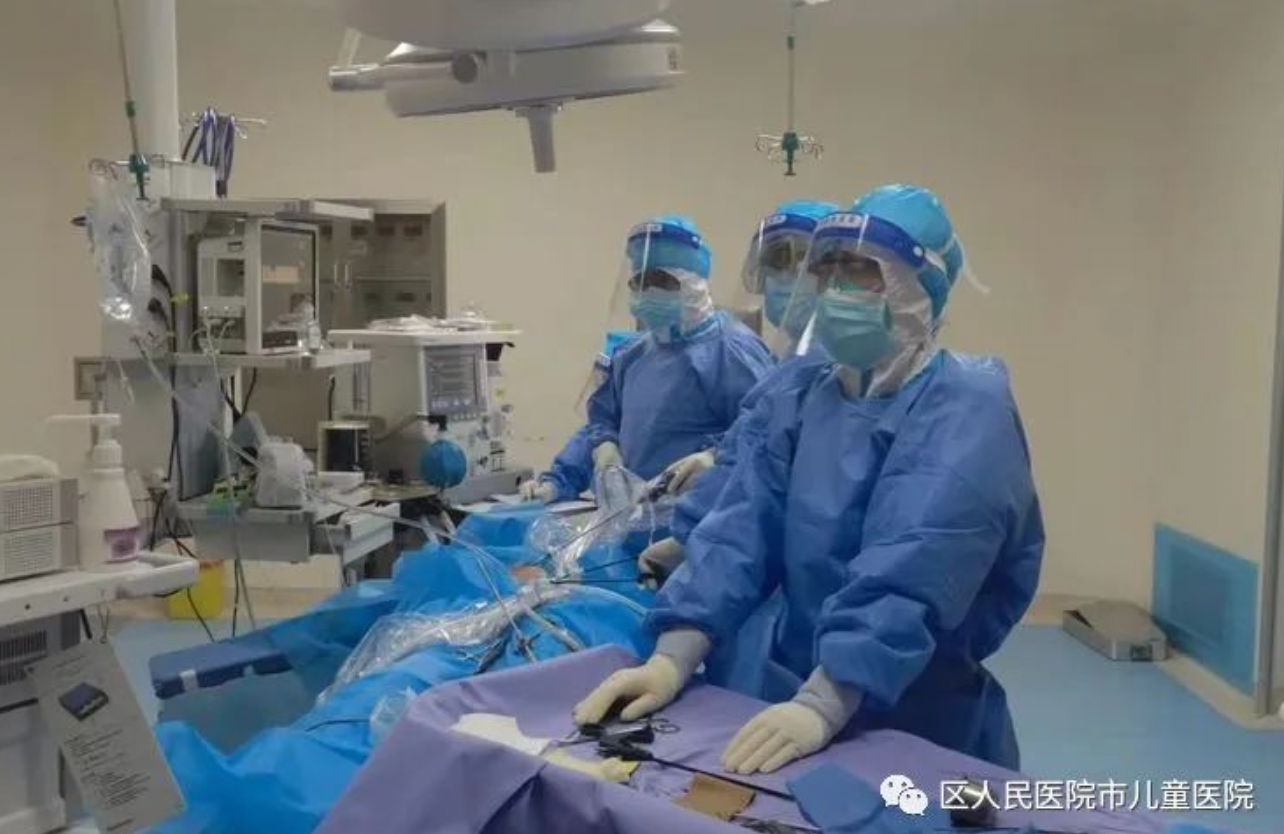 在全市封控期间,儿科接诊一位急性化脓性阑尾炎患儿,患儿当时病情危重,必须立刻展开手术治疗。在核酸结果还未报告的情况下立即采取相应的应急措施,请示相关领导,在领导指示下,按照阳性病人的处置流程立即给予手术治疗。曹振飞、贺银洲等手术团队严格执行二级防护,全副武装。在眼镜、护目镜及防护面屏的重重束缚下,给腹腔镜手术难度明显提高了一个档次。手术人员不畏艰险,克服困难,顺利完成手术,患儿术后恢复良好。