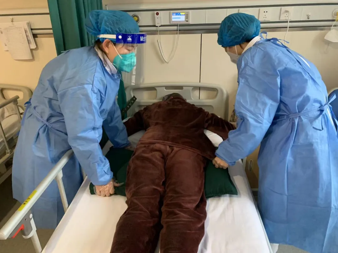 康复医学科在高俊丽主任的带领下,从十版诊疗方案、中医诊疗解读、呼吸机支持、氧疗和血气分析、体液管理等多方面进行学习。周丽丽护士长组织护士参加护理部的所有业务及技能培训,严格落实护理部制定的俯卧位通气打卡和时间汇总,每日检查患者俯卧位通气落实情况,安排责任护士在完成治疗后到患者床旁协助指导俯卧位,利用中午和下午饭后时间使用呼叫器做俯卧位宣教,并到患者床旁去,协助、指导,同时拍摄俯卧位的照片和视频给患者直观、有效的健康宣教,大力推行俯卧位通气治疗,根据患者病情,治疗师们将康复治疗的重点倾向于患者的肺康复,努力实现“防重症,遏病亡”的目标。