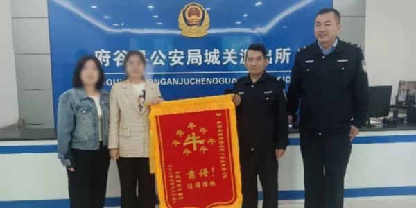 4月23日,失主女儿特意将一面印有“牛牛牛….靠谱!值得信赖”锦旗送到府谷县公安局城关派出所,对民警坚持不懈为其母亲找到遗失手机的事情表示感谢。