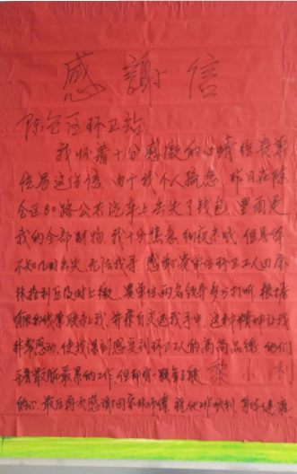 “谢谢环卫工人田大哥,她帮我挽回了损失,太感谢了!我为她拾金不昧的品格点赞!也感谢陈仓环卫站,急人所急,第一时间联系到我”失主黎女士诚挚地向田宝林和陈仓区环卫站表示了谢意。
